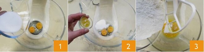 Um die weichen Ofendonuts zuzubereiten, beginnen Sie mit dem Teig: In die Schüssel einer Küchenmaschine mit Flachrührer geben Sie die Eier und fügen den Zucker hinzu 1, dann geben Sie auch den Honig 2 und das gesiebte Mehl 3 hinzu
