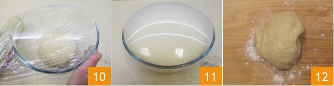 Formen Sie den Teig zu einer Kugel und legen Sie ihn in eine leicht geölte Schüssel, decken Sie ihn mit Frischhaltefolie ab und lassen Sie ihn 2 Stunden im ausgeschalteten Ofen mit eingeschaltetem Licht gehen 10. Nach der erforderlichen Zeit hat sich das Volumen des Teigs verdoppelt 11; nehmen Sie ihn und legen Sie ihn auf eine leicht bemehlte Arbeitsfläche 12.