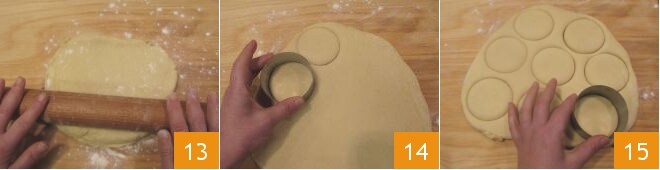 Rollen Sie ihn mit einem Nudelholz zu einer Scheibe von 1 cm Dicke aus 13; mit einem Ausstecher von 7,5 cm Durchmesser schneiden Sie Kreise aus (14-15)
