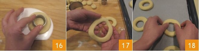 Lösen Sie jeden Kreis und stechen Sie ihn mit einem Ausstecher von 3,5 cm Durchmesser aus, um den Donut mit dem Loch zu erzeugen 16; dann dehnen Sie ihn leicht mit den Händen 17 und legen Sie jeden Donut auf ein mit Backpapier ausgelegtes Backblech 18, wobei Sie einen ausreichenden Abstand zueinander halten (Sie können den restlichen Teig wiederverwenden, ihn etwa 30 Minuten ruhen lassen und dann erneut ausrollen, um weitere Donuts herzustellen).