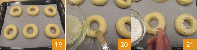 Lassen Sie die Donuts mit Frischhaltefolie abgedeckt bei Raumtemperatur, fern von Luftzügen oder im ausgeschalteten Ofen mit eingeschaltetem Licht mindestens 1 Stunde lang gehen: Die Donuts sollten ihr Volumen verdoppeln 19. Bestreichen Sie sie mit dem Eiweiß 20 und bestreuen Sie einige mit Zuckerstreuseln 21