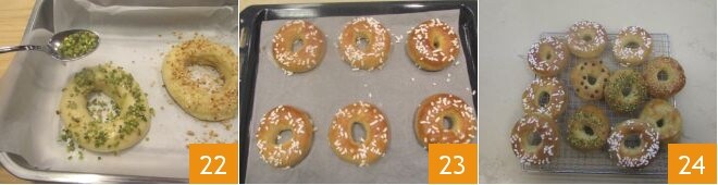 andere mit gehackten Haselnüssen oder Pistazien 22; Sie können auch Schokotropfen verwenden, wenn Sie möchten, wobei Sie darauf achten, sie leicht zu mehlieren und einzufrieren, bevor Sie sie als Dekoration verwenden. Backen Sie die Donuts im vorgeheizten statischen Ofen bei 180 °C für etwa 15 Minuten (160 °C für 5-8 Minuten, wenn der Ofen belüftet ist; vielleicht backen Sie ein oder zwei zum Testen, um die Zeiten besser zu regulieren). Sobald sie gebacken sind 23, nehmen Sie sie heraus und lassen Sie die weichen Donuts auf einem Gitter auskühlen, bevor Sie sie servieren 24