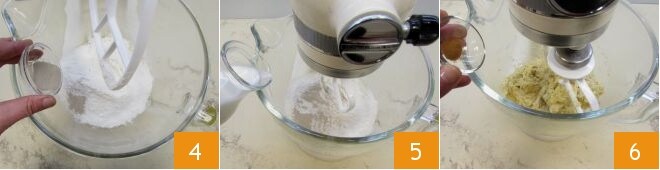 Fügen Sie die Trockenhefe hinzu 4 (lesen Sie auf der Verpackung nach, ob diese in etwas lauwarmer Flüssigkeit aufgelöst werden muss, bevor sie zu den restlichen Zutaten gegeben wird, während Sie bei frischer Hefe 12 g verwenden können, die in etwas lauwarmer Milch aufgelöst werden); dann geben Sie auch die Milch bei Raumtemperatur langsam hinzu, während Sie den Teig bearbeiten 5. Dann fügen Sie das Zimtpulver 6 und zuletzt eine Prise Salz hinzu; arbeiten Sie die Zutaten weiter, bis der Teig homogen ist.