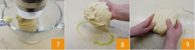 Ersetzen Sie den Flachrührer durch den Knethaken und kneten Sie weiter. Wenn sich die Masse um den Haken wickelt, geben Sie ein Stück weiche Butter nach dem anderen hinzu und warten, bis es aufgenommen wurde, bevor Sie weitermachen 7! Sobald die gesamte Butter aufgenommen ist, stürzen Sie den Teig auf eine leicht geölte Arbeitsfläche 8 und bearbeiten ihn einige Augenblicke: Er sollte ziemlich weich sein 9.