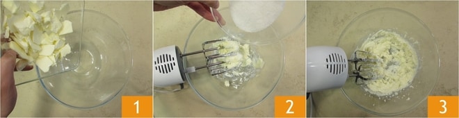 Um die weiche Torte mit Melone zuzubereiten, beginnen Sie mit dem Boden: Geben Sie die weiche Butter in Stückchen in eine Schüssel 1 und beginnen Sie, sie mit einem Handrührgerät zu verarbeiten. Sobald sie weich geworden ist, fügen Sie den Zucker hinzu 2 und schlagen Sie die Mischung, bis sie cremig ist 3.