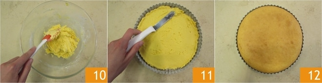 Sobald Sie einen ziemlich dicken und homogenen Teig erhalten haben 10, geben Sie ihn in eine spezielle Form von 22 cm, die zuvor eingefettet wurde, und glätten Sie ihn mit einer Winkellpalette 11. Backen Sie ihn im vorgeheizten statischen Ofen bei 180°C für etwa 25 Minuten. Sobald die Torte fertig ist, nehmen Sie sie heraus und lassen Sie sie bei Raumtemperatur abkühlen 12.