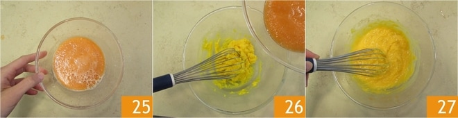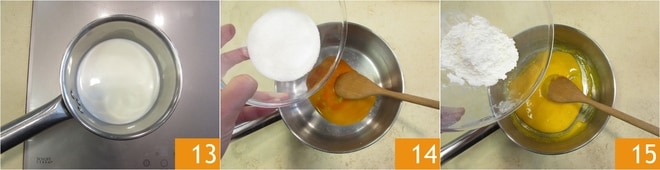 Während die Torte backt, können Sie die Creme vorbereiten: Geben Sie die Milch in einen kleinen Topf und bringen Sie sie zum Sieden 13. In der Zwischenzeit geben Sie in einen anderen Topf die Eigelbe und den Zucker 13. Mischen Sie gut mit einem Holzlöffel und fügen Sie die Stärke hinzu 15. Mischen Sie weiter, bis Sie eine homogene Mischung erhalten, ohne Luft einzuschließen.
