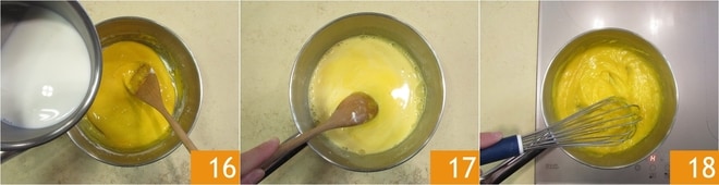 Sobald die Milch zu kochen beginnt, gießen Sie eine kleine Menge davon in die Eimischung 16 und mischen Sie. Fügen Sie dann den Rest der Milch hinzu und mischen Sie erneut 17. Stellen Sie es wieder auf den Herd und kochen Sie unter ständigem Rühren mit einem Schneebesen, bis die Creme eingedickt ist und fast wieder den Siedepunkt erreicht hat 18.