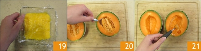 Gießen Sie die fertige Creme in eine Schüssel und decken Sie sie mit Frischhaltefolie direkt auf der Oberfläche ab 19, lassen Sie sie zuerst bei Raumtemperatur und dann im Kühlschrank abkühlen. Wenn die Creme kalt ist, nehmen Sie die Melone: Schneiden Sie sie in zwei Hälften und entfernen Sie die Kerne mit einem Löffel 20. Mit einem Melonenausstecher von 2 cm Durchmesser stechen Sie etwa 30 Bällchen aus 21.