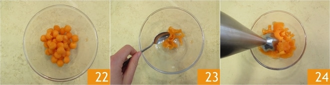 Geben Sie sie in eine Schüssel 22 und bewahren Sie sie im Kühlschrank auf, bis Sie sie verwenden. Nehmen Sie nun die restliche Melone und kratzen Sie mit einem Löffel 100 g Fruchtfleisch heraus. Geben Sie es in eine Schüssel 23 und pürieren Sie es mit einem Stabmixer 24.