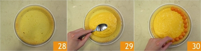 Drehen Sie nun den Boden der Torte auf einen Teller, sodass die Vertiefung nach oben zeigt 28. Geben Sie die Creme hinein und glätten Sie sie 29. Nehmen Sie nun die Melonenbällchen und platzieren Sie sie um den Rand herum auf halber Höhe der Torte 30.