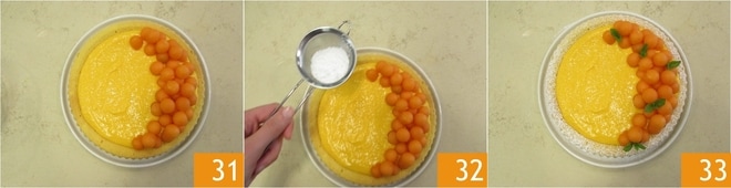 Fügen Sie dann die anderen hinzu, um einen Halbmond zu bilden 31 und bestäuben Sie den Rand der weichen Torte mit Puderzucker 32. Dekorieren Sie mit Minzblättern und servieren Sie 33.
