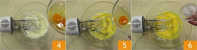 Fügen Sie das erste Ei hinzu 4 und verarbeiten Sie es mit dem Handrührgerät, bis es gut aufgenommen ist. Fügen Sie dann auch das zweite Ei hinzu und verarbeiten Sie es, bis es ebenfalls vollständig eingearbeitet ist. Fügen Sie nun das Backpulver hinzu 6.