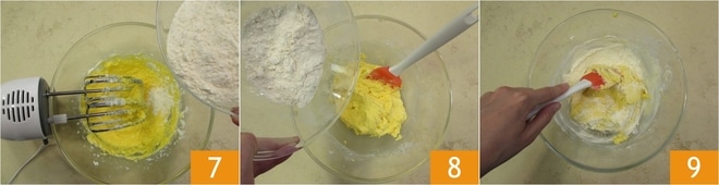 Geben Sie nun einen Teil des Mehls hinzu 7 und mischen Sie weiter mit dem Handrührgerät 7. Fügen Sie dann das restliche Mehl hinzu 8 und mischen Sie mit einem Spatel 9.
