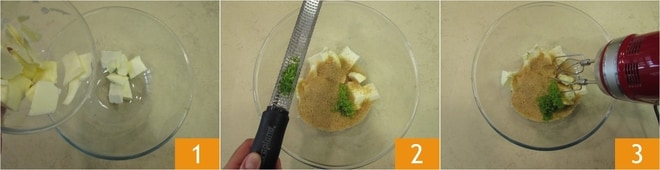 Um den weichen Kokos-Limetten-Kuchen zuzubereiten, geben Sie die weiche Butter 1, den Zucker und die Limettenschale 2 in eine große Schüssel. Arbeiten Sie mit den elektrischen Schneebesen 3.