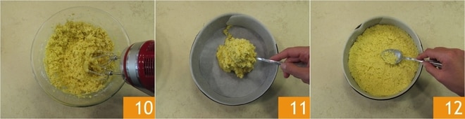 Den Teig noch einige Sekunden bearbeiten 10. Eine 21 cm Backform mit Backpapier auslegen, den Teig einfüllen 11. Den Teig einfüllen 11 und mit dem Rücken des Löffels glätten 12. Die Mischung in eine 21 cm Form füllen, die mit Backpapier ausgelegt ist. Die Oberfläche vorsichtig mit einem Löffel glätten, mit wenig Kokosraspeln dekorieren und bei 150° für 45 Minuten backen. Aus dem Ofen nehmen, leicht abkühlen lassen. Ausformen