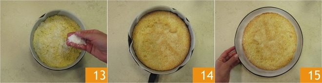 Mit wenig Kokosraspeln dekorieren 13 und im vorgeheizten statischen Ofen bei 150° für 45 Minuten backen. Aus dem Ofen nehmen, leicht abkühlen lassen, dann aus der Form lösen und den weichen Kokos-Limetten-Kuchen genießen 15.