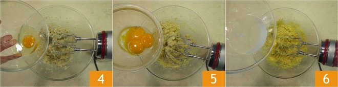 Fügen Sie das ganze Ei hinzu 4 und bearbeiten Sie es einige Sekunden. Fügen Sie dann auch die Eigelbe hinzu 5 und arbeiten Sie, bis sie vollständig eingearbeitet sind. Das Kokosöl in einem dünnen Strahl einarbeiten 6, bei Raumtemperatur gelassen, sodass es flüssig und einfacher zu gießen ist.