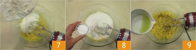 Fügen Sie nun dem Teig das Mehl Type 00 7, den Kokosraspel und das Backpulver 8 hinzu. Sobald eine homogene und weiche Masse entstanden ist, den Saft von zwei Limetten 9 hinzufügen.