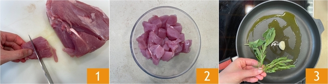 Um das zarte Putenfleisch in der Pfanne zuzubereiten, kümmern Sie sich zuerst um das Fleisch. Schneiden Sie die Putenbrust in etwa 2 cm große Stücke 1 2. In einer gut erhitzten Antihaftpfanne das Öl, die Knoblauchzehe, den Salbei und den Rosmarin zugeben 3.