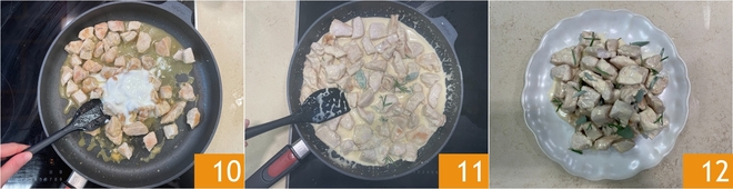 Umrühren 10, mit einem Deckel abdecken und etwa 10 Minuten bei mittlerer Hitze kochen lassen. Wenn das Fleisch zart und die Sauce cremig ist 11, ist die Pute fertig und kann heiß serviert werden 12.