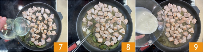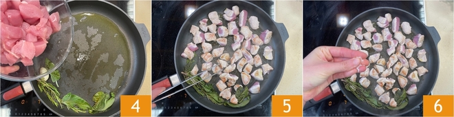 Bei niedriger Hitze anbraten. Geben Sie die Putenstücke hinzu 4 und braten Sie sie bei mittlerer Hitze von beiden Seiten an 5, dann salzen Sie 6.