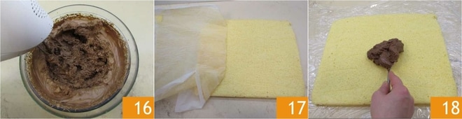 und verteilen Sie sie, wobei Sie 2 cm vom Rand freilassen 19. Rollen Sie den Biskuitteig vorsichtig auf, indem Sie sich mit der Frischhaltefolie helfen 20, schließen Sie die Enden und lassen Sie die Rolle etwa 1 Stunde im Kühlschrank fest werden, zusammen mit der übrigen Ganache 21.