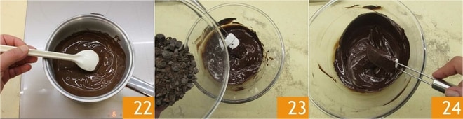 In der Zwischenzeit kümmern Sie sich um die Dekoration. Zum Wie man das Temperieren macht der Schokolade mit der Impfmethode zerkleinern Sie einfach die Schokolade und teilen sie in zwei Teile: 2/3 und 1/3. Geben Sie dann 200 g zerkleinerte Zartbitterschokolade in einen Wasserbadtopf (oder in die Mikrowelle) 22, lassen Sie sie schmelzen und messen Sie die Temperatur der Schokolade mit einem Konditorthermometer. Sobald die Schokolade geschmolzen ist und eine Temperatur von 45°C erreicht hat, geben Sie sie sofort in eine Schüssel und fügen Sie die restlichen 100 g zerkleinerte Schokolade hinzu 23. Rühren Sie, bis sie vollständig verschmolzen ist: Messen Sie die Temperatur erneut, die 29°C-31°C erreichen sollte 24.