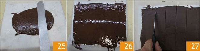 Geben Sie die Schokolade auf ein Blatt Backpapier 25 und verteilen Sie sie gut mit einem Spatel, bis eine dünne Platte entsteht 26, und lassen Sie sie abkühlen, so wird sie fest 26. Danach können Sie sie mit einem glatten Messer in Streifen schneiden und dann in Quadrate 27.