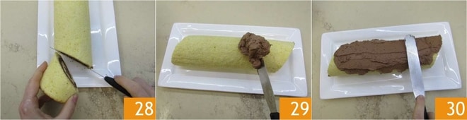 Nehmen Sie die gefüllte Rolle, schneiden Sie die Ränder ab, indem Sie die beiden Enden abschneiden (Sie können sie als reichhaltigen Snack genießen oder seitlich positionieren, wie wir es beim verschneiten Weihnachtsbaumstamm gemacht haben) 28. Verstreichen Sie die übrige Ganache 29, bis der gesamte Baumstamm bedeckt ist 30.