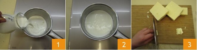 Um die Ganache mit weißer Schokolade zuzubereiten, geben Sie die Sahne in einen kleinen Topf 1 und bringen Sie sie fast zum Kochen 2. In der Zwischenzeit die Schokolade fein hacken 3 und in eine große Schüssel geben.