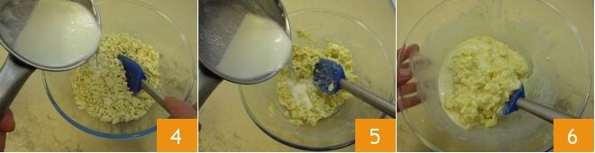 Geben Sie etwa 1/3 der heißen Sahne auf die weiße Schokolade 4 und beginnen Sie zu rühren, während Sie die Sahne bei sehr niedriger Hitze warm halten. Fügen Sie dann die Hälfte der restlichen Sahne hinzu (während Sie die Sahne weiterhin warm halten) und rühren Sie weiter 5. Fügen Sie auch den Rest der Sahne hinzu und rühren Sie kräftig 6, bis Sie eine glatte und homogene Masse erhalten. Es wird einige Zeit und Energie erfordern.