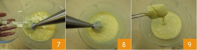 Fügen Sie dann auch die weiche Butter in Würfeln nach und nach hinzu 7, und rühren Sie mit einem Spatel, um sie aufzulösen; Sie können auch mit einem Stabmixer pürieren, um eine glattere Textur zu erhalten 8. An diesem Punkt verwenden Sie Ihre weiße Schokoladenganache nach Belieben 9.