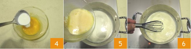 Verdünnen Sie die gezuckerten Eigelbe mit etwas von der warmen Milch-Vanille-Mischung 4, dann geben Sie sie in den Topf zusammen mit dem Rest der Milch 5. Mischen Sie gut mit dem Schneebesen 6 und lassen Sie es eindicken, bis die Creme leicht den Löffel überzieht, wenn Sie ihn eintauchen. Sobald es fertig ist, nehmen Sie es vom Herd.