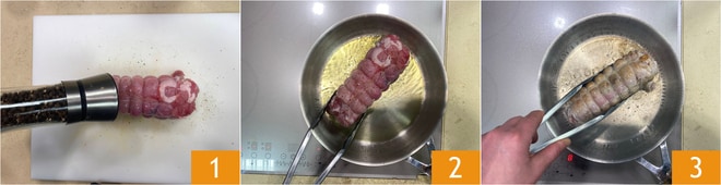Um das Wellington aus Rollbraten und Wirsing zuzubereiten, erhitzt zunächst eine Edelstahl- oder Antihaftpfanne gut. Salzt und pfeffert 1 das Fleischstück nach Belieben, gebt dann einen Schuss Öl in die Pfanne und bratet den Kaninchenrollbraten bei starker Hitze an 2, wobei ihr ihn häufig wendet, um ihn gleichmäßig 3 zu versiegeln.