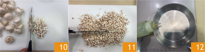 Ihr könnt euch nun dem Wirsing zuwenden: Nehmt die Blätter, entfernt den härtesten mittleren Teil, ohne die Blätter ganz zu brechen, wenn möglich (wenn nicht, ist es auch in Ordnung), dann blanchiert sie für einige Minuten und gebt sie in Eiswasser, damit sie ihre leuchtende Farbe behalten. Dann abtropfen lassen, behutsam abtupfen und beiseite stellen. Geht zu den Champignons über, um die Duxelles vorzubereiten: Reinigt die Champignons von eventuell vorhandenem Erdreich, schneidet sie dann 10 und hackt sie fein 11. Erhitzt einen Schuss Öl in der Pfanne 12.