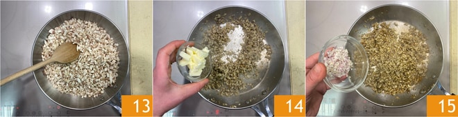 Lasst die Champignons bei hoher Hitze unter häufigem Rühren 13 zusammenfallen, so dass sie ihr Wasser verlieren. Salzt nach Belieben. Gebt dann Butter 14 und fein gehackte Schalotte hinzu 15.