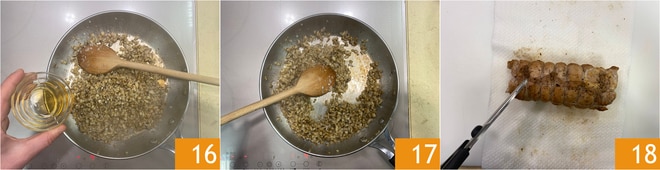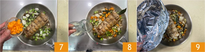 Setzt das Kochen bei milderer Hitze für einige Minuten fort, zum Schluss mit Brandy ablöschen 16. Wartet, bis der Alkohol verdampft ist, dann die Hitze ausschalten und beiseite stellen 17. Nehmt den Rollbraten aus dem Ofen 18 (bewahrt den Bratenrückstand auf, um daraus eine cremige Begleitsauce zu mixen!).
