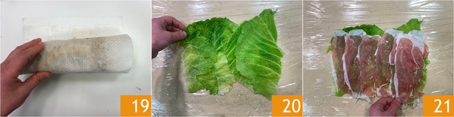 Tupft ihn mit einem Küchenpapier ab 19. Nehmt ein Stück Frischhaltefolie und legt es auf die leicht angefeuchtete Arbeitsfläche, damit es gut haftet. Darauf legt die leicht überlappenden Wirsingblätter 20, darauf die Scheiben rohen Schinkens 21.
