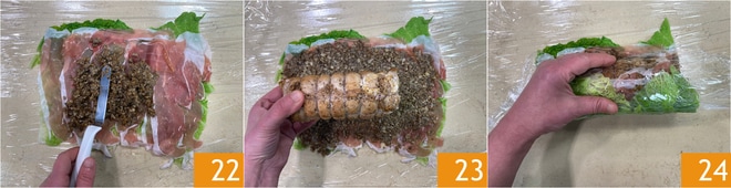 Verteilt die Champignon-Duxelles auf dem Schinken, so dass eine feine, gleichmäßige Schicht entsteht 22. Legt den Kaninchenrollbraten in die Mitte 23, schneidet dann mit einer Schere die überstehenden Teile ab und lasst dabei Ränder stehen (schneidet die Wirsingblätter, achtet darauf, die Frischhaltefolie nicht zu schneiden). Wickelt nun alles mit Hilfe der Frischhaltefolie ein 24, zieht es fest.