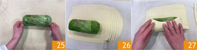 Schließt es wie ein Bonbon 25, es sollte schön straff und kompakt sein. Macht ein paar kleine Löcher in die Folie, damit die Luftblasen entweichen können. Lasst es 2 Stunden im Kühlschrank fest werden. Nehmt die rechteckige Blätterteigrolle und schneidet mit einem Teigrädchen ein paar Streifen für eventuelle Dekorationen aus. An einem Rand des Blätterteigs legt den Rollbraten umgedreht und von der Folie befreit 26; beginnt zu rollen 27, bis er in die richtige Richtung und vollständig bedeckt ist. Schneidet auch den überschüssigen Teig an den Seiten ab.