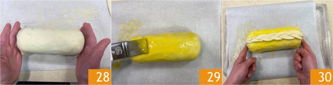 Versiegelt die Enden gut, schließt es fast wie ein Päckchen und klappt die Teigränder unter den Rollbraten 28. Legt es auf ein mit Backpapier ausgelegtes Blech, bestreicht es gut mit Eigelb, das mit Sahne verquirlt wurde 29. Bringt auch die mit den Blätterteigstreifen hergestellte Dekoration an 30 und bestreicht auch diese.