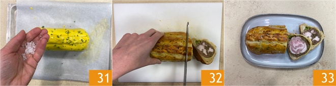 Bestreut mit Thymian und Flockensalz 31, backt im vorgeheizten Umluftofen bei 170°C für etwa 35 Minuten. Nachdem ihr es aus dem Ofen genommen habt, lasst den Rollbraten 15 Minuten ruhen, bevor ihr ihn schneidet 32. Serviert das Wellington aus Rollbraten und Wirsing 33 mit der Sauce, die aus dem Bratenrückstand des Fleisches gewonnen wird, guten Appetit!