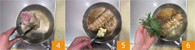 Denk auch an die Enden 4. Sobald es gut angebraten ist, könnt ihr in derselben Pfanne die Butter 5, die Kräuter 6 hinzufügen und die Zubereitung bei starker Hitze fortsetzen. Ihr könnt es nappieren (d.h. mit einem Löffel nach und nach den Bratenrückstand auf die Oberfläche des Rollbratens verteilen).