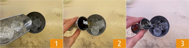Um den Whiskey Sour zuzubereiten, geben Sie zuerst das Eis in den Shaker 1 zusammen mit dem Bourbon Whiskey 2 und dem Zuckersirup 3.