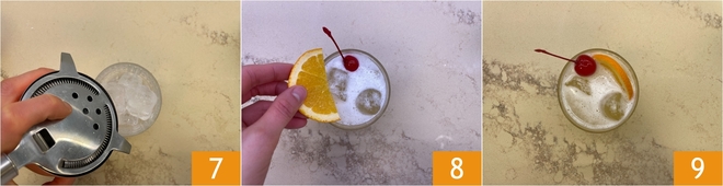 Filtern Sie den Cocktail durch das Barsieb 7 und füllen Sie die Gläser bis zum Rand, dann garnieren Sie mit einer Orangenscheibe 8 und einer Maraschinokirsche 9. Ihr Whiskey Sour ist bereit, genossen zu werden!
