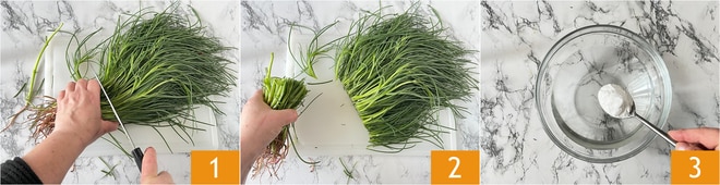 Um die Agretti zu reinigen, legen Sie sie zunächst auf ein Schneidebrett und schneiden Sie mit einem Messer den unteren Teil der Wurzeln ein 1 und entfernen Sie ihn 2. Wenn Sie möchten, können Sie diesen Vorgang auch durchführen, indem Sie wenige Agretti gleichzeitig von Hand abbrechen. Gießen Sie Wasser in eine große Schüssel und fügen Sie einen Esslöffel Natron hinzu 3.