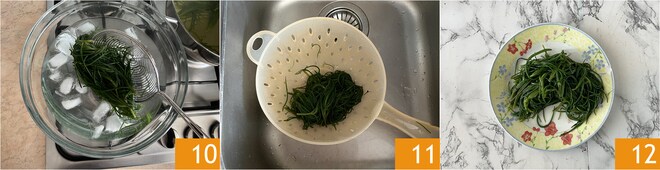 Um die Farbe der Agretti zu erhalten, schöpfen Sie sie mit einem Schaumlöffel ab und legen Sie sie in eine Schüssel mit Wasser und Eis 10; auf diese Weise stoppen Sie sofort das Kochen. Lassen Sie sie gut abtropfen 11 und würzen Sie sie vor dem Servieren mit einem Schuss Öl 12.