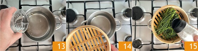 Um die Agretti zu dämpfen, gießen Sie ein Glas Wasser in einen Topf 13, stellen Sie den Dämpfeinsatz darüber 14 und legen Sie die zuvor gereinigten Agretti hinein. Würzen Sie mit Salz 15.