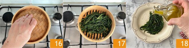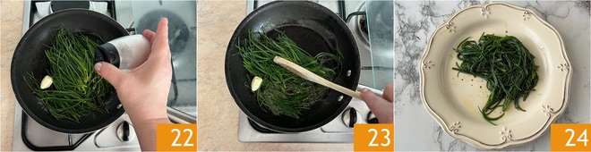 Decken Sie mit einem passenden Deckel ab 16 und lassen Sie sie 15 Minuten kochen 17. Übertragen Sie die Agretti auf einen Teller und würzen Sie sie mit Öl 18 und einer Prise schwarzem Pfeffer.